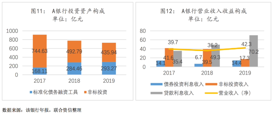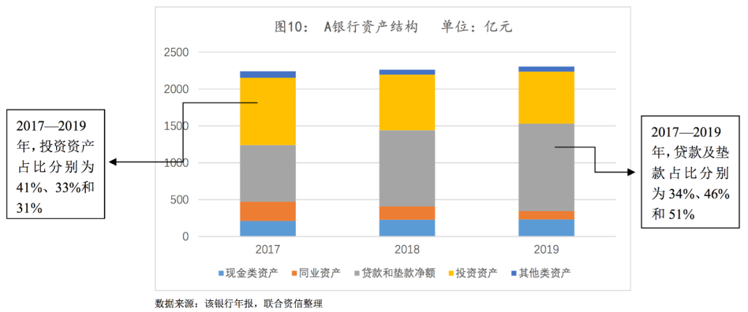 我们选取的A银行具有对公存款占存款总额比重高、非标投资规模较大面临压降压力以及信用风险加速暴露等城商行经营特点,上述因素均对其盈利水平形成较大负面影响。A银行资产规模处于2000至3000亿元区间,从资产结构来看,近年来,随着资管新规以及金融去杠杆政策的不断推进,A银行在“回归本源”的监管导向下,投资资产规模不断压缩,贷款和垫款占资产总额的比重显著上升(见图10)。