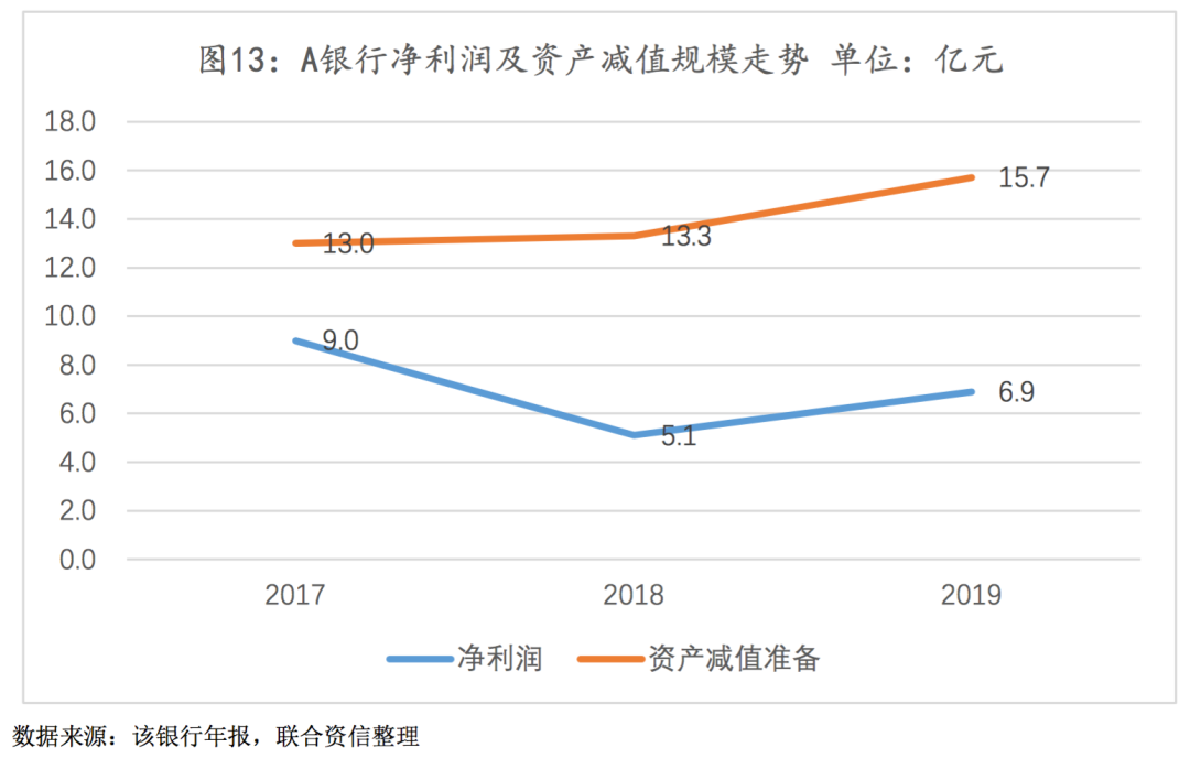 投资资产规模和投资收益双降,但贷款业务的稳步发展促进了营业收入的回升;另一方面,贷款及投资资产质量较大的下行压力使得资产拨备计提力度较大,对盈利水平产生一定负面影响。2017—2018年,A银行配置的国债和金融债等标准化债券规模快速增长(见图11),并逐步压缩非标资产投资规模,但由于标准化债券整体利率远低于非标资产利率,债券利息收入无法弥补非标投资收益,投资收益规模及其对全行营业收入的贡献程度明显下降,营业收入随之下降;2019年,得益于业务逐步回归传统信贷,A银行贷款规模增长所带来的利息收入快速增加,推动营业收入有所回升,并成为营业收入增长的最主要驱动因素(见图12)。另一方面,在宏观经济增速放缓、债券市场违约率上升的市场背景下,A银行以非标投资为主的投资资产所面临的信用风险水平上升,故其加大了相关资产减值准备计提力度,加之在信贷资产五级分类严监管的政策下,A银行亦保持了较大的贷款拨备计提力度,对净利润的实现产生一定负面影响(见图13)。