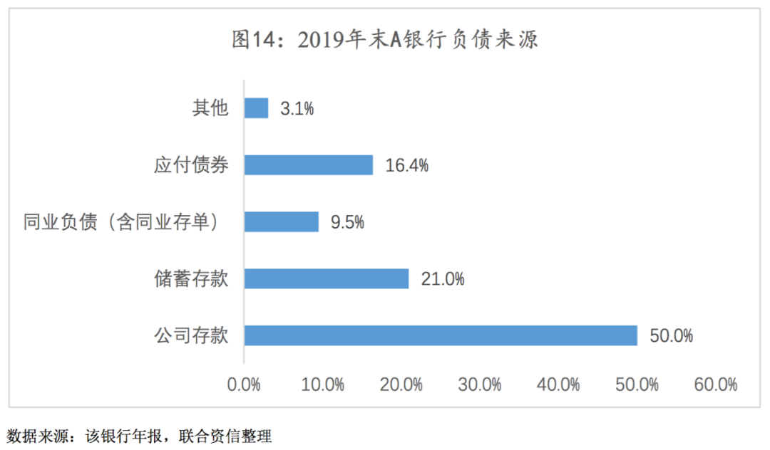 负债端资金成本压力较大,负债结构有待进一步优化。城商行竞争过程中普遍面临在乡镇营业网点数量远低于农商行、在城区客户信任度不如国有大行和股份制银行的问题,致使其成本较低的储蓄存款来源不足,多数城商行通过吸收稳定性欠佳以及成本相对较高的公司存款以满足资产配置需求。近年来,为降低负债端资金成本压力,A银行持续加大揽储力度,不断压降公司存款占负债总额的比重,但公司存款占比仍处于较高水平(见图14),其中公司定期存款占负债总额的比重为29.7%,负债端资金成本压力较大。