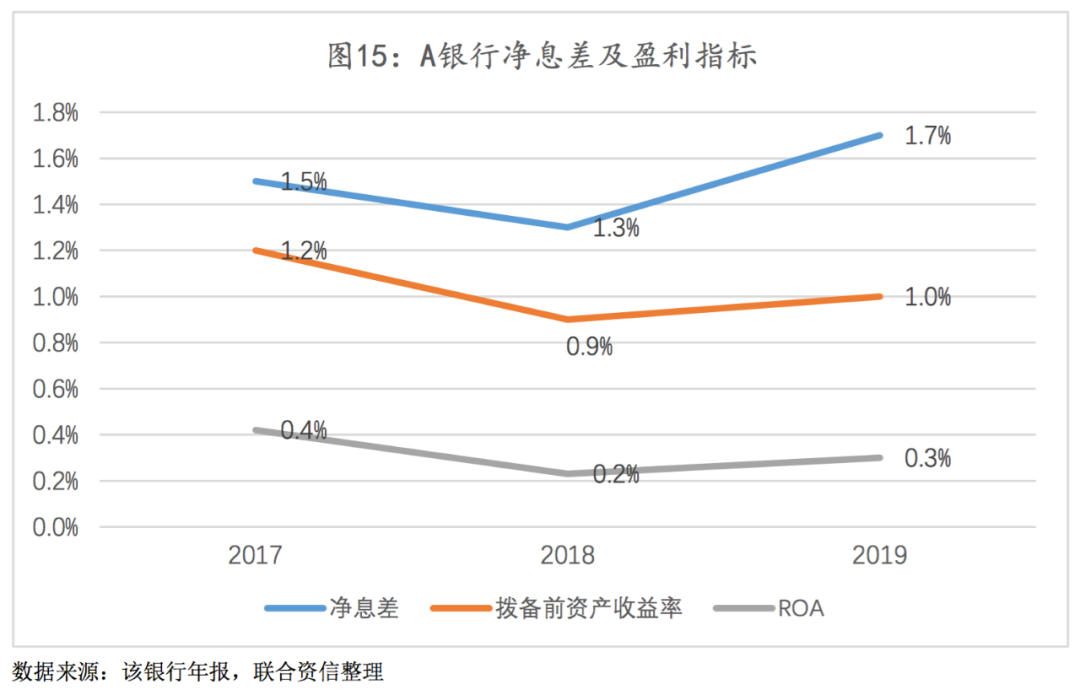 净息差低于同业平均水平,盈利能力较弱。A银行将资产端资金重点配置于定价水平呈下行趋势的信贷类资产,同时增加投资收益率偏低的标准化债券配置力度,这样便削弱了资产端生息能力,加之负债端资金成本压力仍然较大,A银行净息差水平远低于商业银行和城商行平均水平(见图15)。此外,由于贷款及投资资产质量面临较大下行压力,A银行加大了资产减值准备计提力度,致使盈利指标整体呈下降趋势。