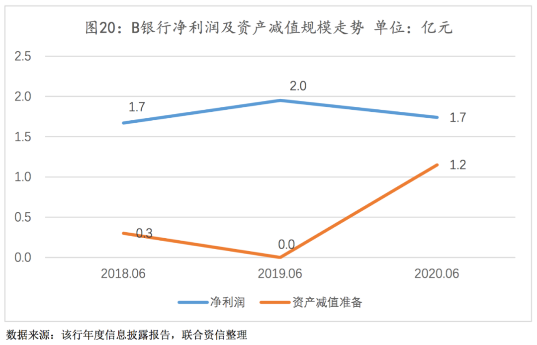2020年受新冠肺炎疫情影响,信贷资产质量下行明显,贷款拨备已显不足;贷款定价优势有所弱化,净利润增长明显承压。2020年以来,在新冠肺炎疫情的影响下,B银行6月末的不良贷款率上升至将近3%,同时其显著加大了贷款减值计提力度(见图20),但由于利润规模有限对拨备计提产生一定约束,其拨备覆盖率降至117%,已低于监管对于该指标的最低要求。若B银行增加贷款减值准备计提力度直至拨备覆盖率达标,则势必会对其净利润的实现产生明显负面影响。假设在其他条件不变的情况下,若2020年6月末B银行拨备覆盖率达到150%,则上半年所实现的净利润约为0.4亿元,较上年同期下降约80%。此外,在政策导向以及同业竞争不断加剧的影响下,B银行贷款定价优势有所弱化,净息差水平已与商业银行平均净息差水平较为接近,且受限于当地经济增长乏力、农商行无法跨区域展业等因素,2020年上半年B银行贷款规模增速明显放缓,净利润增长明显承压。