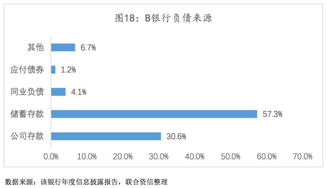 较好的储蓄存款客户基础为负债端资金成本的控制带来一定优势。作为地方性农商行,B银行在当地营业网点覆盖范围广、服务向下延伸较为深入,因此具有良好的储蓄存款基础(见图18),近三年储蓄存款占存款总额的比重维持在60%以上,一定程度上节约了资金成本。
