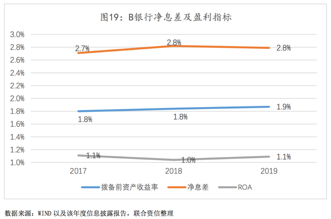 净息差及资产利润率均高于同业平均水平。得益于资产端贷款业务的稳步发展,以及债券投资所带来的稳定收益,B银行资产端生息水平较为稳定;负债端方面,较大的储蓄存款规模为B银行负债端带来一定资金成本优势,致使净息差水平远高于商业银行及城商行平均水平,盈利指标保持相对稳定(见图19)。