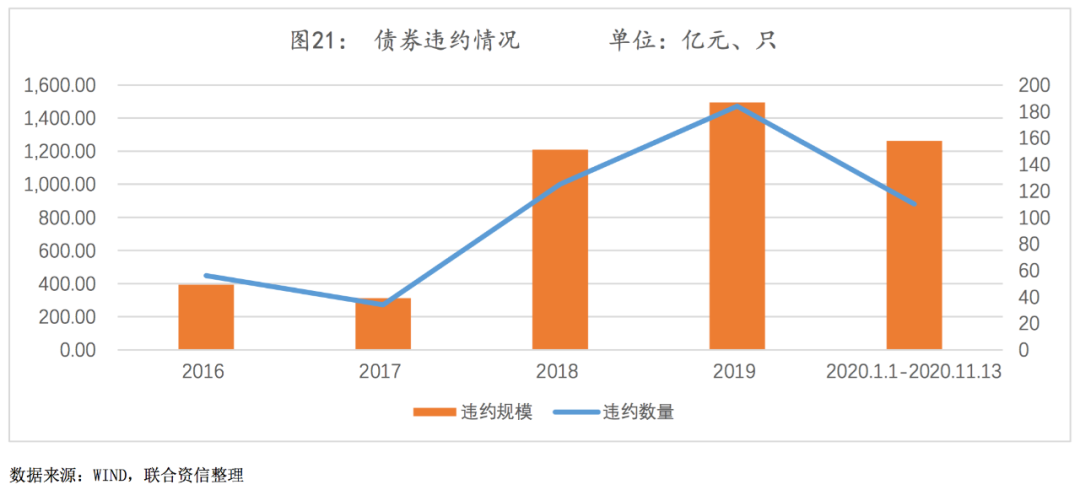 债券市场违约事件频发将对投资收益产生负面影响。自营投资业务是商业银行金融市场业务的重要组成部分,近年来中小银行将投资资金重点配置于利率债,同时仍持有部分信用债,以通过承担一定的信用下沉风险来获取相对较高的投资收益。但现阶段我国经济进入新常态,在国家产业结构持续调整优化、经济增速放缓的大背景下,债券市场违约事件增多,部分投资资产将面临亏损风险。2020年2月,北大方正因集团重组,其发行的23只债券同一天提前到期未能兑付,违约规模合计345.4亿元,紧随其后的中信国安集团、东旭集团、泰禾集团等5家违约规模均在50亿元及以上。根据wind资讯显示,今年以来共有109只债券发生违约,违约规模合计1260.8亿元(见图21),已与2019年全年违约规模较为接近,今年全年企业债券违约规模或将创造历史新高。另一方面,在违约事件增多的背景下,商业银行将加大利率债等低风险、低收益的投资资产配置力度,此举将对投资收益产生负面影响。