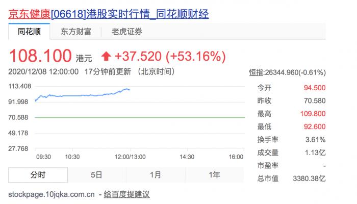 据招股书披露,京东健康的总收入在2020年前三季度为132亿元人民币,同比增长77.1%;截至2020年9月30日为止的十二个月,京东健康的年活跃用户为8000万。截至中午休市,其每股股价报108.1港元/股,股价涨幅53.16%,总市值逼近3400亿港元。