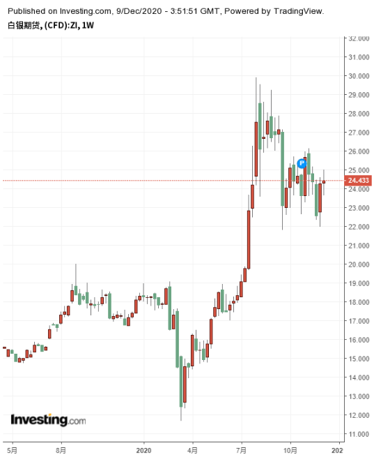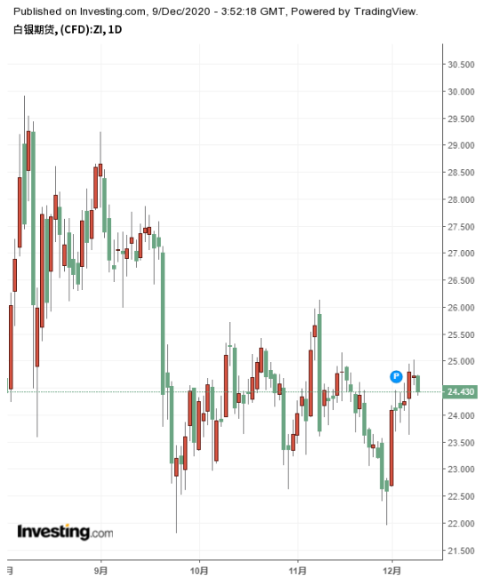 印度SK Dixit Charting分析师苏尼尔·库马尔·迪克西特(Sunil Kumar Dixit)对此表示赞同。迪克西特在发送给英为财情Investing.com的邮件中表示,白银23.6美元的底部已经稳固,且守住了24.30美元,现在有可能测试24.90-25.20美元。