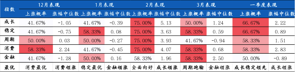 风格而言,整个一季度中,成长股稳定上涨概率最高。涨幅中位数而言,成长板块的表现最佳,也预示在春季乐观行情深度演绎的背景下,成长股的“弹性”将“本色出演”。