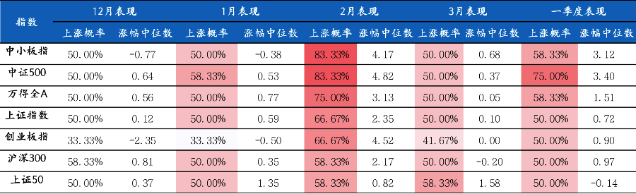 进一步来看,过去12年中,主要指数在一季度上涨的概率均大于等于50%,春季行情确实存在。从月份表现来看,2月是春季行情的高潮,万得全A上涨的概率高达75%,涨幅中位数为3.13%,实现了较好的业绩表现。
