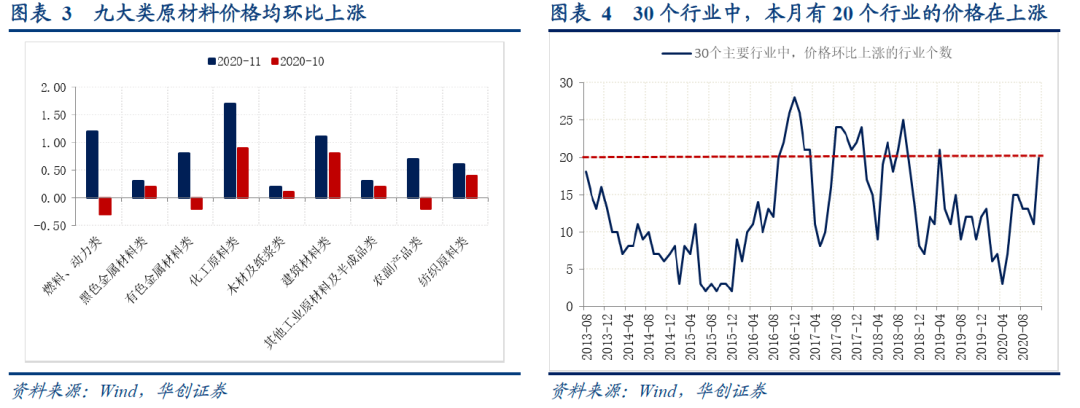 第二,从购进价格看,九大类材料价格环比全部上涨。10月份上涨的原材料价格在11月继续上涨,并且涨幅较上月进一步扩大,主要有化工原料类、建筑材料类、纺织原料类。10月份下跌的原材料价格在11月均由跌转涨,主要有燃料动力类、有色金属材料类、农副产品。