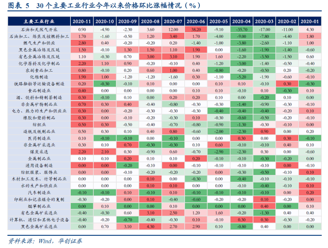 环比来看,受国际油价上涨影响,石油相关行业价格继续上涨且涨幅扩大,化学原料和化学制品制造业价格上涨2.2%,化维制造业价格上涨1.9%,石油、煤炭及其他燃料加工业价格上涨1.7%。北方省市在11月集中进入供暖季,供暖需求大幅增加,燃气生产和供应业、煤炭采选业价格上涨。受益于黑色和有色金属价格上涨,金属相关行业价格由跌转涨,黑色金属冶炼和压延加工业价格上涨1.5%,有色金属冶炼和压延加工业价格上涨1.1%。此外,涨幅扩大的还有非金属矿物制品业、造纸和纸制品业和纺织业。价格下跌的主要有计算机、通讯和其他电子设备制造业、有色金属矿采选和汽车制造业。