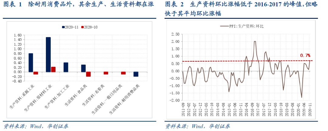 第一,从生产和生活资料看,除了耐用消费品都在涨。生产资料环比涨幅皆快于生活资料,体现投资强于消费的现状;生产资料的上游涨幅尤其显著。生产资料环比0.7%的上涨速度,与2018年9月份的高点一致,低于2016-2017的峰值,但略快于2016-2017年的平均环比涨幅(0.55%)。