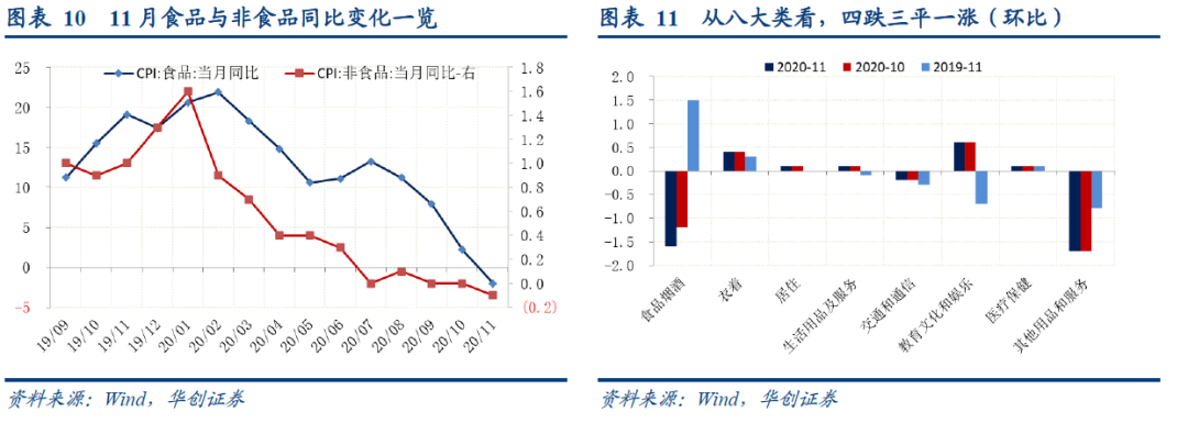 非食品CPI环比从上月上涨0.1转为下降0.1%,同比由上月持平转为下跌0.1%。冬装新品上市,服装价格上涨推动衣着项CPI环比上涨0.3%;房租、家用器具、医疗服务价格下行分别带动居住、生活用品及服务、医疗保健价格环比走平。非食品价格环比走弱,主要受旅游出行相关价格下行的拖累。11月是旅游淡季,居民出行大幅减少,飞机票、旅游和宾馆住宿价格分别下降15.6%、4.4%和3.4%。交通和通信价格环比下跌0.2%,主要受交通燃料拖累;其他用品和服务价格环比下跌0.6%。