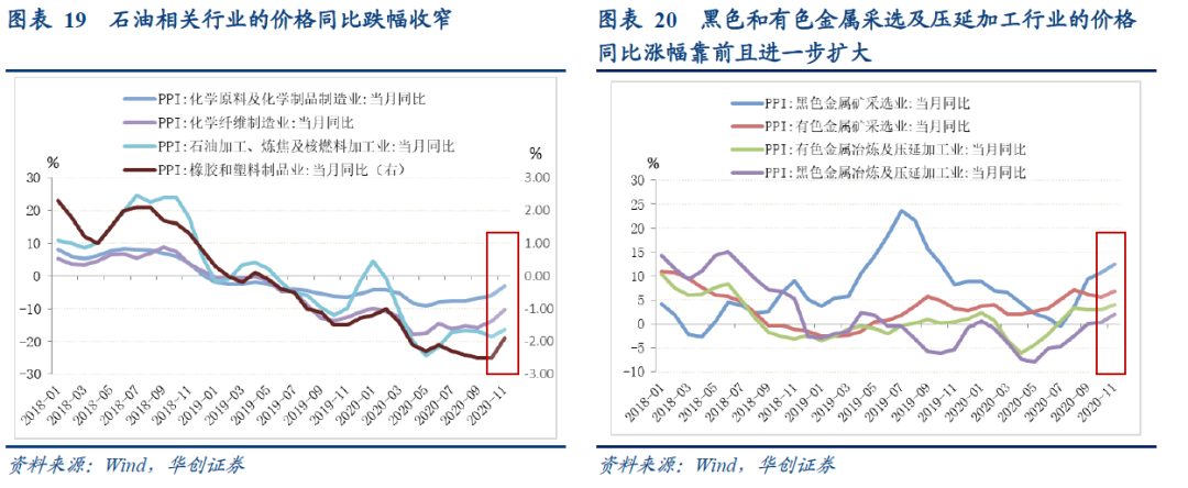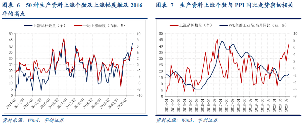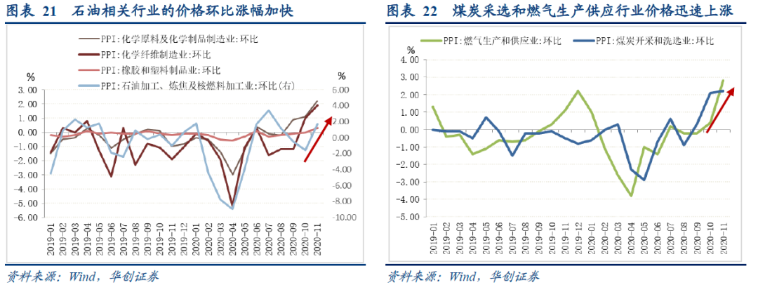 从基本面看,我国经济大概率会在四季度及明年1季度出现短暂的微过热状态。在此背景下,经济升温将从量向价格扩散,目前广泛的工业品涨价就是很好的例证。PPI同比修复的速度会加快,年底PPI同比跌幅或收窄至-1.1%。我们预计PPI同比明年上半年将保持上行趋势,大约在明年3月份翻正,年中高点可能触及3%。此外,还值得注意的一点是,如果明年海外财政刺激方案和疫苗普及超预期,在需求和大宗商品价格的带动下,不排除PPI同比更快速上行的可能。