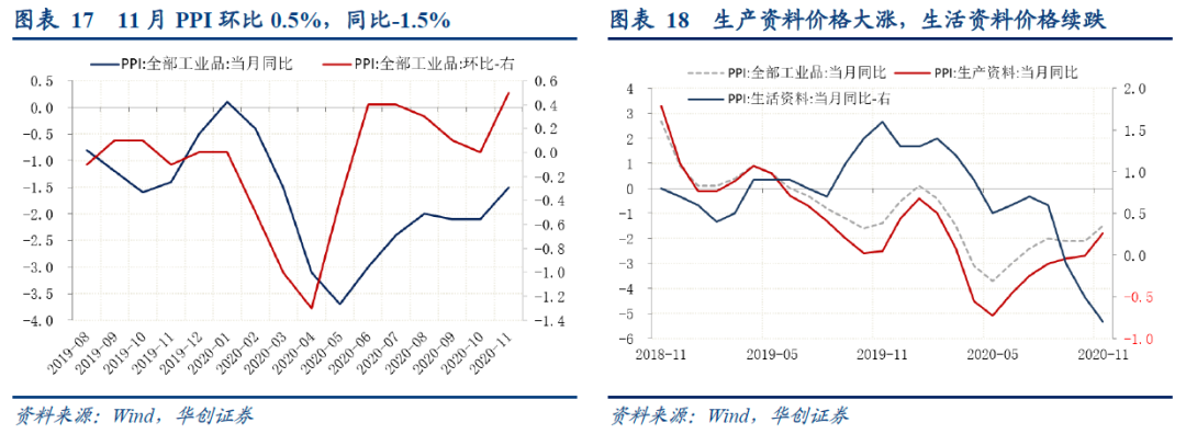 11月PPI同比下降-1.5%,降幅较上月收窄0.6个百分点;同比跌幅中,翘尾因素影响为0,新涨价因素影响约-1.5个百分点。PPI环比由上月持平转为上涨0.5%,涨幅创两年以来的新高。从两大类看,生产资料价格同比下降1.8%,降幅较上月大幅收窄0.9个百分点;环比上涨0.7%,较上月涨幅扩大0.6个百分点。生活资料价格同比下降0.8%,跌幅较上月扩大0.3个百分点;环比由-0.1%转为0.1%。