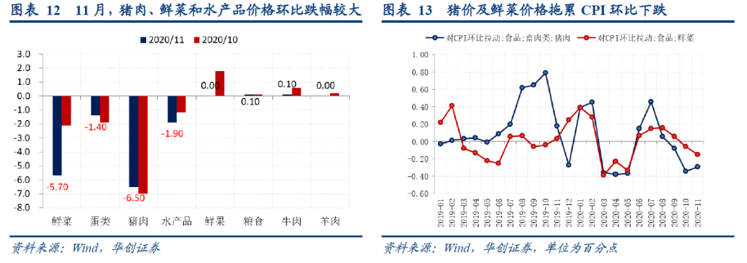 11月,食品和非食品价格环比同步走弱。猪价、鲜菜价是食品价格环比下跌的主要拖累项,非食品价格主要受旅游出行相关价格下行的拖累。去除能源和食品的核心CPI同比连续五个月处于0.5%的低位,在一定程度上体现了我国经济修复过程中消费需求复苏偏慢的特征。