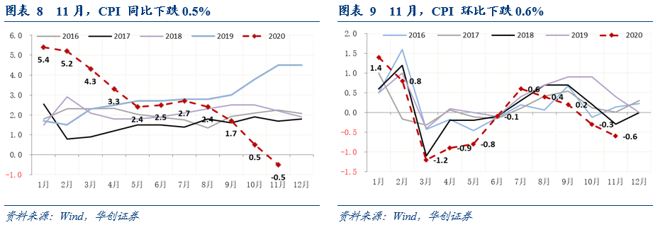 2020年11月CPI同比下跌0.5%,其中,翘尾因素影响0个百分点,新涨价因素影响-0.5个百分点。同比涨幅较上月回落1个百分点,跌幅超出市场预期(WIND一致预期CPI同比上涨0.1%)。CPI环比跌0.6%,跌幅超出历史季节性走势。