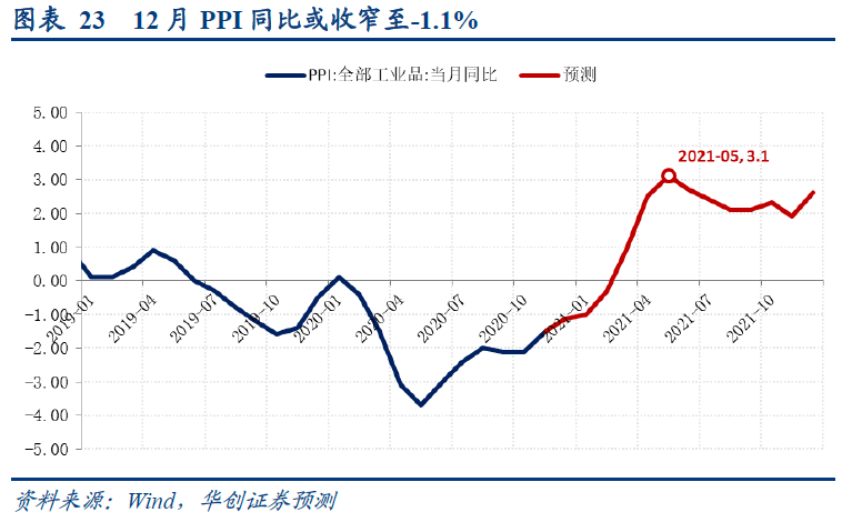 12月CPI同比跌幅或将收窄,明年CPI同比前高后低,通胀呈温和回升趋势,中性情形下CPI同比全年中枢在1.4%左右,不会对货币政策形成掣肘,不是投资者关注的焦点,相比而言,PPI的走势才更值得关注。