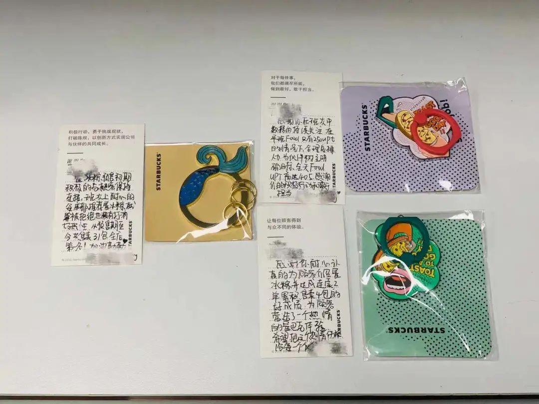这些小礼物都是星巴克内部的、不对外出售的小东西,从徽章、钥匙扣到笔记本、玩偶、杯子不等。