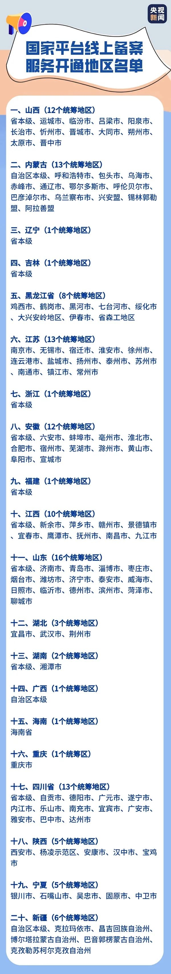 目前,全国已有20个省区市开通了国家平台线上备案服务,名单见下图↓