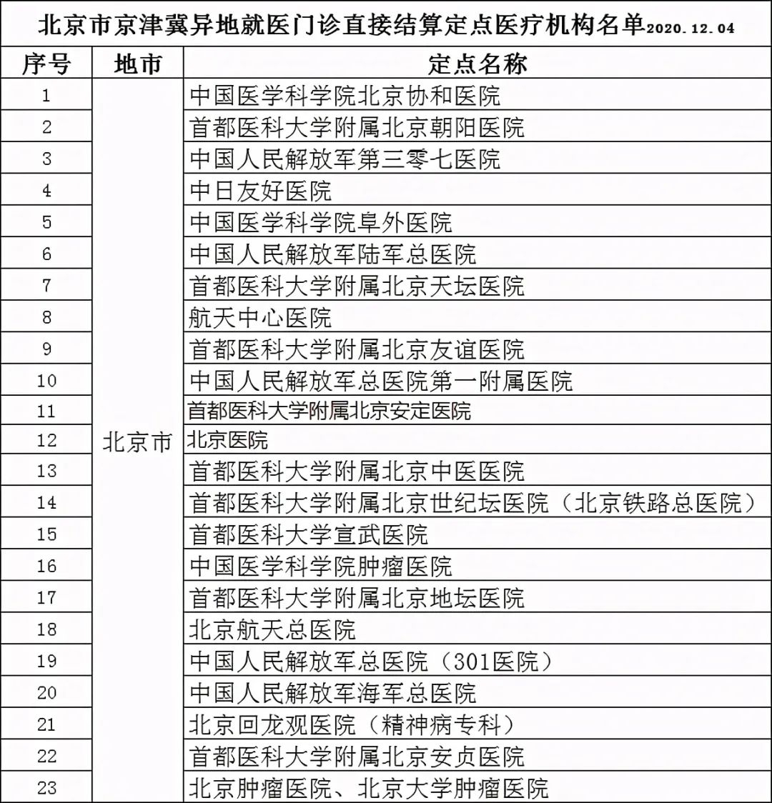 从河北省医疗保障局官网获悉,经省、市两级医疗保险经办机构通过跨省系统联调测试验收,截至11月30日,河北省14个统筹区全部实现上线试运行,并确定将全省101家定点医疗机构纳入京津冀异地就医普通门诊费用直接结算试点定点医疗机构范围。