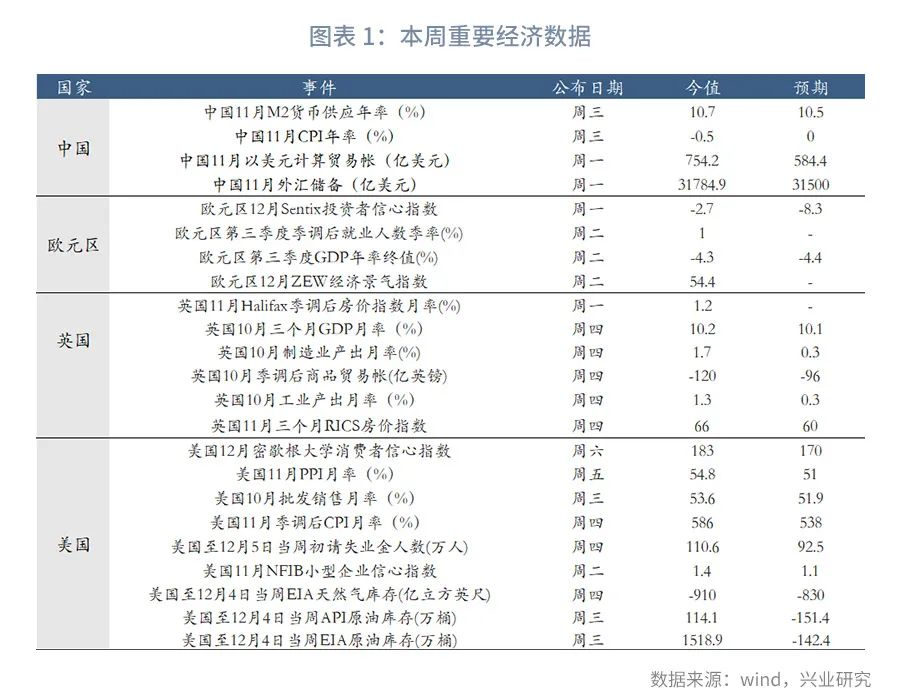 本周各国公布的经济数据总体比较平稳。美国公布,美国12月密歇根大学消费者信心指数初值为81.4,高于预测值76.5和前值76.9。美国11月核心PPI月率为0.1%,低于预测值0.2%和前值0.3%。美国10月批发销售环比月率为1.8%,高于预测值0.8%,略低于前值0.4%。美国11月季调后CPI环比为0.2%,略高于预测值0.1%和前值0%。美国至12月5日当周初请失业金人数为85.3万人,远高于预测值72.5万人和前值71.6万人。美国11月NFIB小型企业信心指数为101.4,低于预测值102.5以及前值104。
