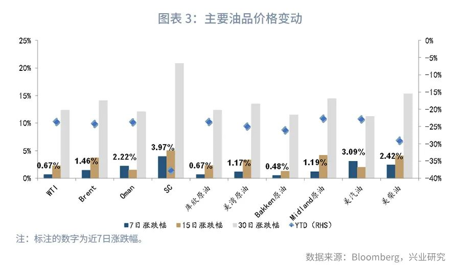 走势回顾:截至12月11日,WTI周度涨幅0.67%,Brent周度涨幅1.46%,Oman周度涨幅2.22%,SC周度涨幅3.97%。