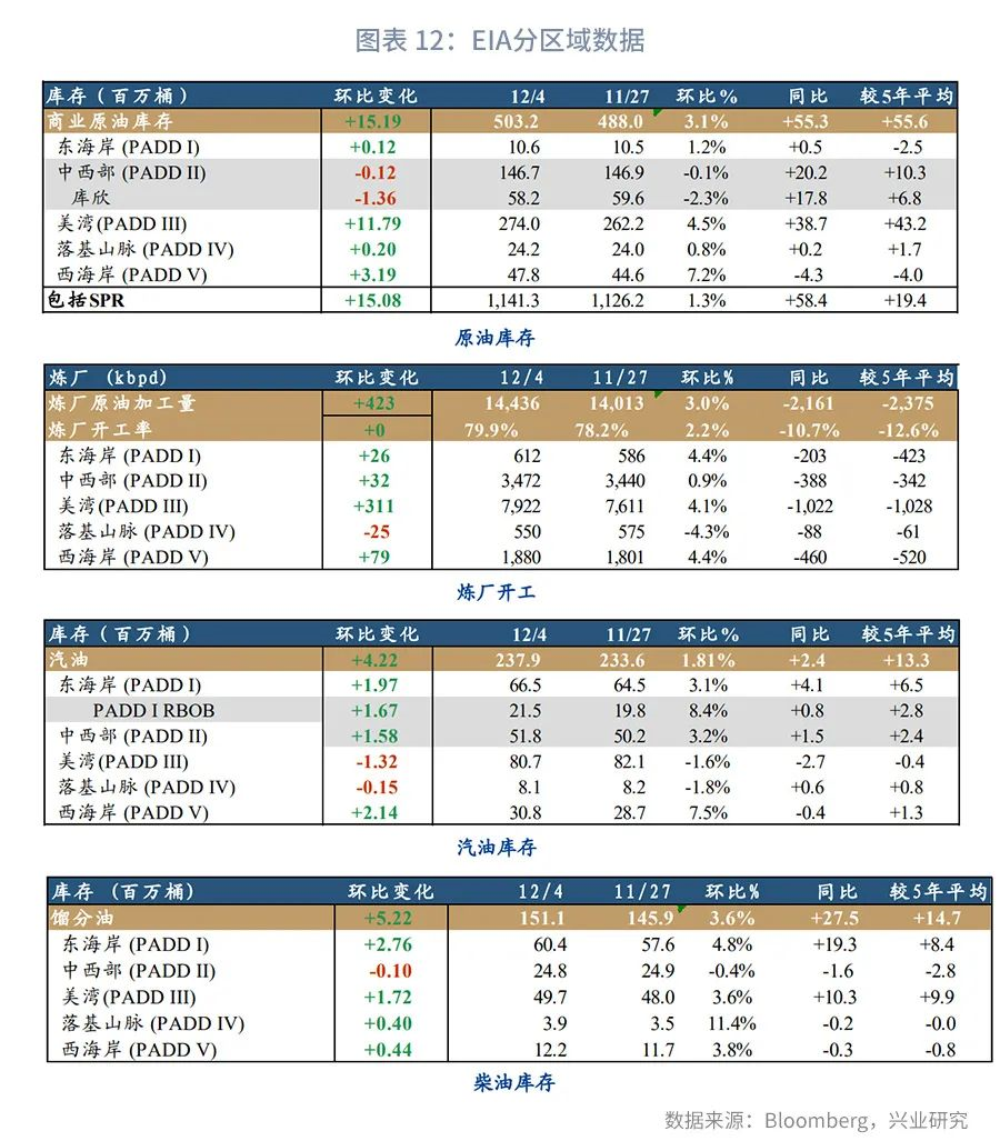 美国至12月4日当周API原油库存为114.1万桶,高于前值-151.4万桶。截至12月4日的EIA库存数据显示,美国原油库存增加1586.8万桶至1518.9万桶,预测值减少142.4万桶,前值为-67.9万桶。汽油库存增加73.1万桶至422.2万桶。精炼油库存增加198.4万桶至522.2万桶。进出口方面,本周原油进口量增加108万桶/天至647.9万桶/天,原油出口量减少162.2万桶/天至183.4万桶/天。汽油进口量增加26.7万桶/天至78.9万桶/天,汽油出口量增加21.6万桶/天至90.5万桶/天。需求方面,汽油需求环比减少37.3万桶/天至760万桶/天,馏分油需求环比减少40万桶/天至338.9万桶/天,航空燃油需求环比增加17.5万桶/天至130.9万桶/天。