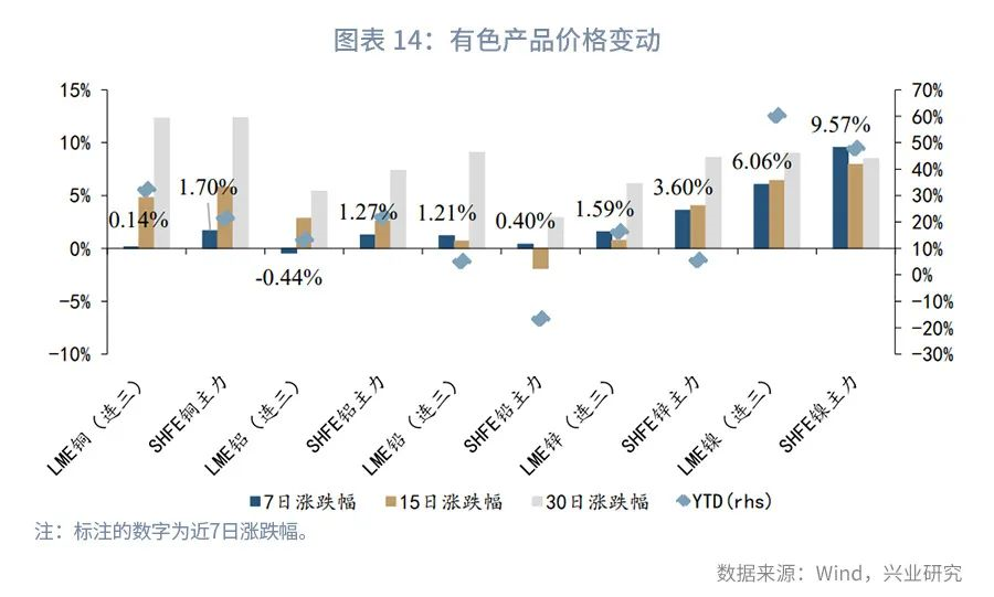 有色:需求端表现强劲。铜价在经历半个月的快速上涨后,短期上行阻力加大,但由于全球宽松流动性的基本格局不变且国内消费好于预期,铜价仍中期旧具备上涨动力。