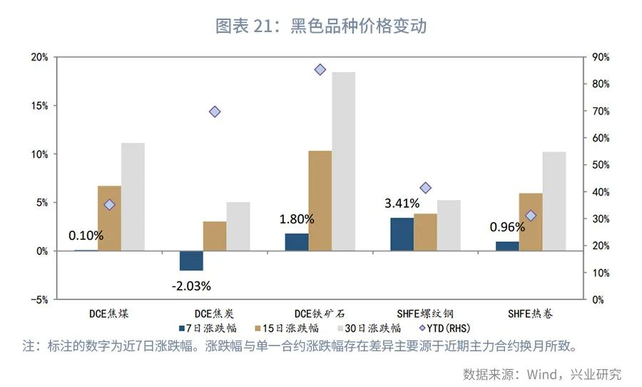 本周黑色品种涨跌不一,焦煤涨0.1%,焦炭跌2.03%,铁矿石涨1.80%,螺纹钢涨3.41%,热卷涨0.96%。