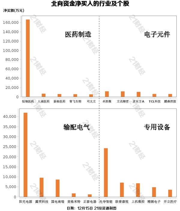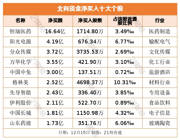 从净买入金额来看,北向资金增持了32个行业,医药制造居首,净买入金额达21.06亿元,其中恒瑞医药净买入16.64亿元;其次是电子元件行业,净买入6.58亿元。