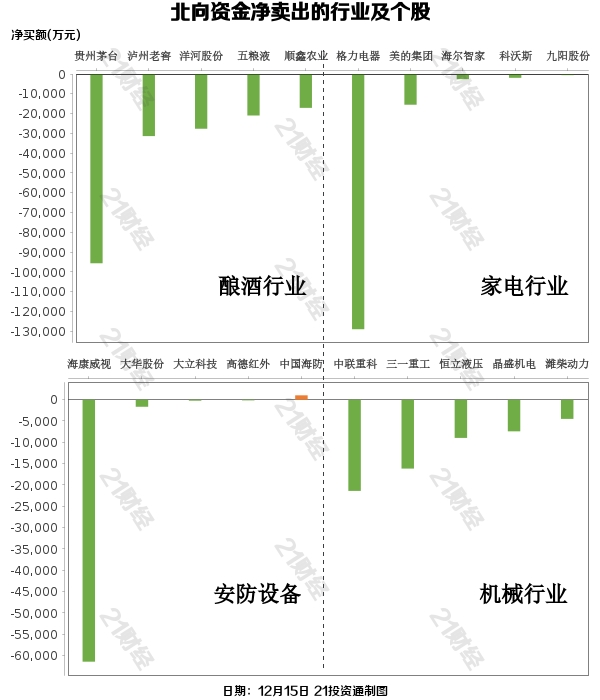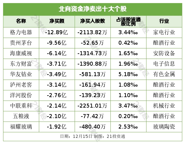 北向资金净卖出格力电器(000651.SZ)、贵州茅台(600519.SH)、海康威视(002415.SZ)、东方财富(300059.SZ)、华友钴业(603799.SH)居前,其中,格力电器被净卖出12.89亿元,贵州茅台被净卖出9.56亿元,海康威视被净卖出6.14亿元,东方财富被净卖出3.71亿元,华友钴业被净卖出3.49亿元。