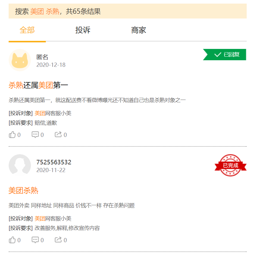 根据黑猫投诉相关数据,仅键入关键词“杀熟”和“美团”,相关结果显示就有65条,其中2018年1条,2019年9条,2020年55条;
