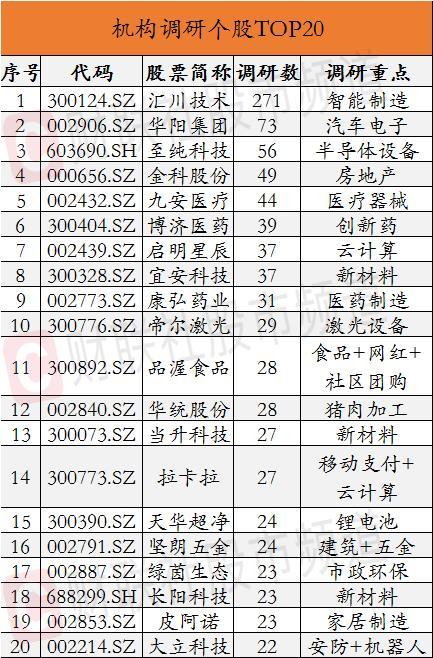 财联社(上海,研究员 郑建宏)讯,财联社星矿数据显示,从近期(12月13日至12月21日)A股上市公司机构调研公告来看,机构调研规模较之前持平,机构调研TOP20榜单个股均被20家以上机构调研,机构调研方向主要集中在工业设备制造、大消费(住房消费+食品消费)、医药医疗等领域。其中,汇川技术最受关注,近期被271家机构扎堆调研。此外,华阳集团、至纯科技、金科股份、九安医疗等个股均被40家以上机构密集调研。近期机构调研榜单如下图: