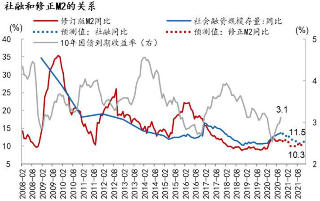 与2020年信用持续扩张不同,伴随着货币政策回归中性,2021年社融和M2同比增速将见顶回落,信用扩张边际收缩,那这是否意味着利率也会迎来拐点?我们认为与利率更相关的是货币供需之间的矛盾,可以用社融和M2同比增速之差来衡量,若两者在明年双双见顶回落,那下一个问题是谁回落得更快?这与货币政策取向有密切关系。