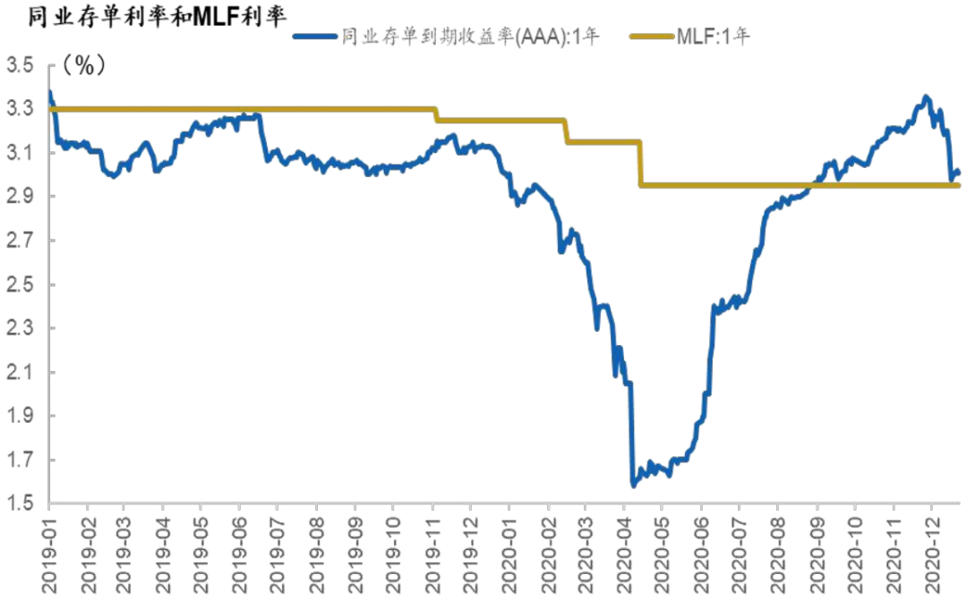 图9:2020年同业存单利率先下后上,在政策利率上方波动