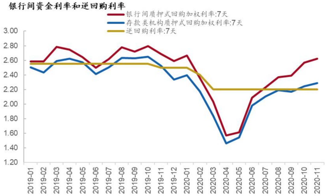 图8:2020年银行间资金利率先下后上,在政策利率上方波动