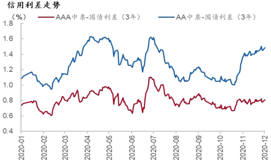 跟随无风险利率走势,二级市场信用债到期收益率先下后上。与到期收益率表现不同的是信用利差先上后下。一季度,受疫情影响,信用环境受到冲击,尽管流动性宽松,流动性溢价回落,但违约风险上升,信用利差走阔;二至三季度,信用环境逐渐回暖,违约风险受控,信用利差压缩。11月份,信用违约事件增多,市场恐慌情绪升温,违约风险再度上升,推动信用利差走阔。