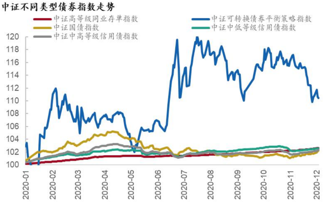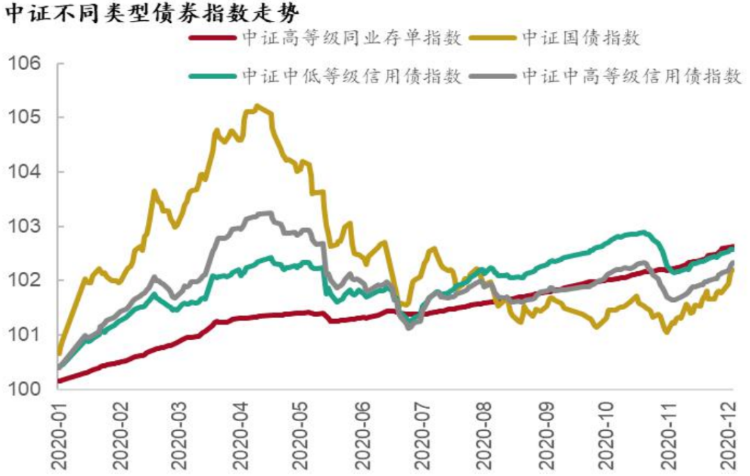 从债券收益表现上看,2020年上半年的顺序为利率债>中高等级信用债>中低等级信用债;下半年的顺序为中低等级信用债>中高等级信用债>利率债。截止到12月23日,中证指数反映的不同债券品种收益表现为,可转债(10%)>高等级同业存单(2.6%)≥中低等级信用债(2.6%)>中高等级信用债(2.3%)>国债(2.2%)。