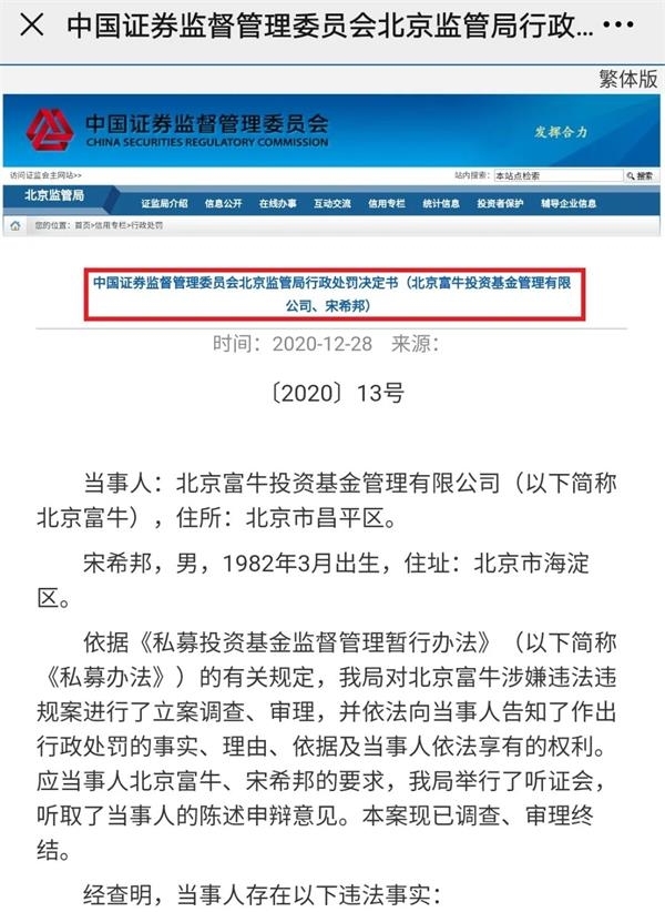 近日,北京证监局责令北京富牛投资基金管理有限公司对其违法行为进行改正,给予警告并处罚,北京富牛的直接负责主管人员宋希邦也一并领了罚单。