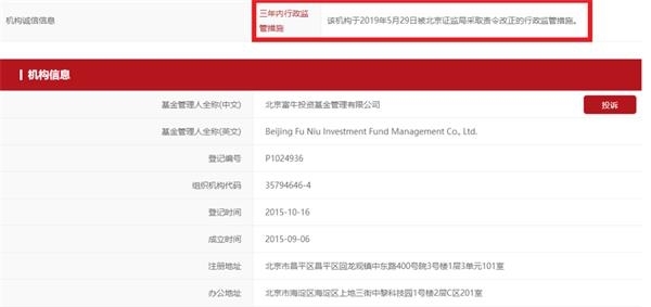 基金业协会信息显示,北京富牛并非第一次受罚,该机构此前曾于2019年5月29日被北京证监局采取责令改正的行政监管措施。