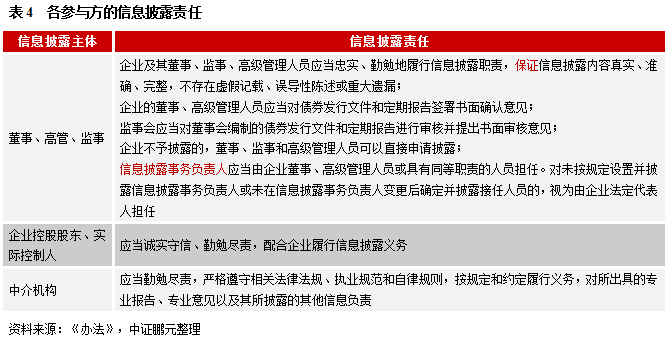 《办法》强化了企业及董事、监事和高级管理人员,控股股东和实际控制人的信息披露主体责任,同时要求企业建立信息披露事务管理制度,设置并披露信息披露事务负责人,由企业董事、高级管理人员或具有同等职责的人员担任。此外,《办法》明确承销机构、会计事务所、评级机构等中介机构相应的信息披露义务和职责。其中,债券承销机构应当对债券募集说明书的真实性、准确性、完整性进行核查,确认不存在虚假记载、误导性陈述和重大遗漏。中介机构应对企业提供的文件资料的真实性、准确性、完整性进行必要的核查和验证。