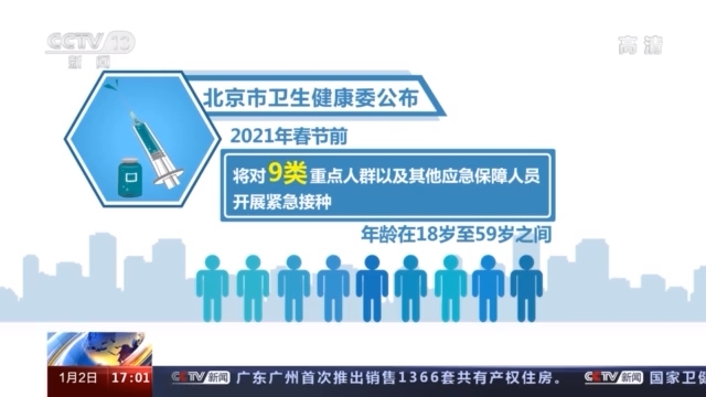 北京市卫生健康委公布,2021年春节前,将对9类重点人群以及其他应急保障人员开展紧急接种,年龄在18岁至59岁之间。2021年1月中旬完成所有重点人群首针接种,2—4周后完成第二针。根据国家整体部署,明确9类重点人群包括: