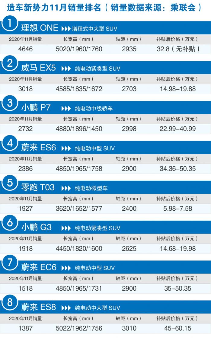 (11月造车新势力销量排行榜,数据来源:乘联会)