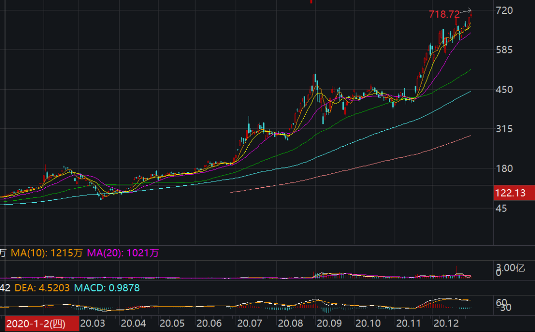 2020年12月31日,特斯拉在最后一个交易日站上700美元,盘中创下新高718.72美元,截至收盘,特斯拉收报705.67美元,涨幅1.57%。以全年最高价718.72和最低价72.10来计算,特斯拉股价2020年上涨9.97倍。