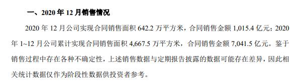 万科A公告,2020年12月公司实现合同销售面积642.2万平方米,合同销售金额1015.4亿元;2020年1~12月公司累计实现合同销售面积4667.5万平方米,合同销售金额7041.5亿元。
