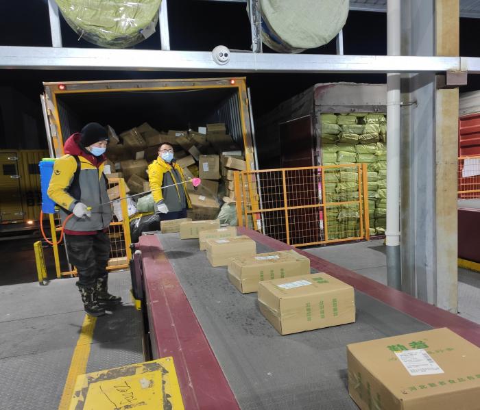 韵达快递工作人员正在执行“消杀”流程