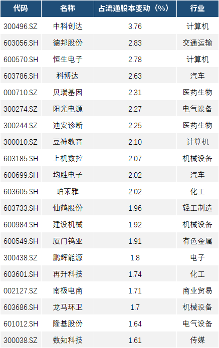 个股由于股本数量的大小存在明显的差异,如果仅按股本数量的变化进行排序,得到的结果最终只能是所谓的“大盘股”。基于此,对于“北上资金”个股的变动情况,如下两表,我们分别统计了12月“北上资金”持股流通股本增加、减少的前20只个股。