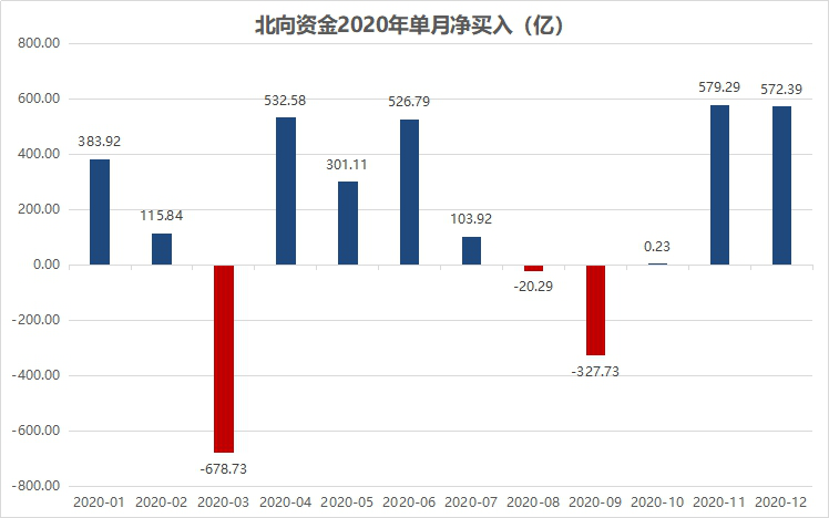 12月北上资金净买入572.39亿,与11月基本持平,为2020年北上资金净买入额单月次高,其中沪股通净买入380.98亿,深股通净买入191.41亿。