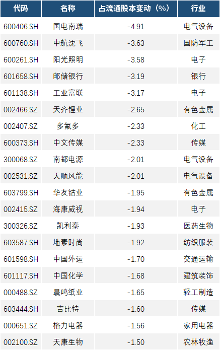 ▲12月“北上资金”持股流通股本减少的后20只个股
