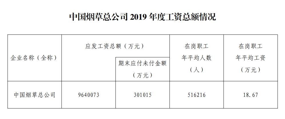 数据显示,2019年度中国烟草总公司应发未发金额964亿元,期末应付未付金额30.1亿元,在岗职工年平均人数51.6万人,在岗职工年平均工资18.67万元。